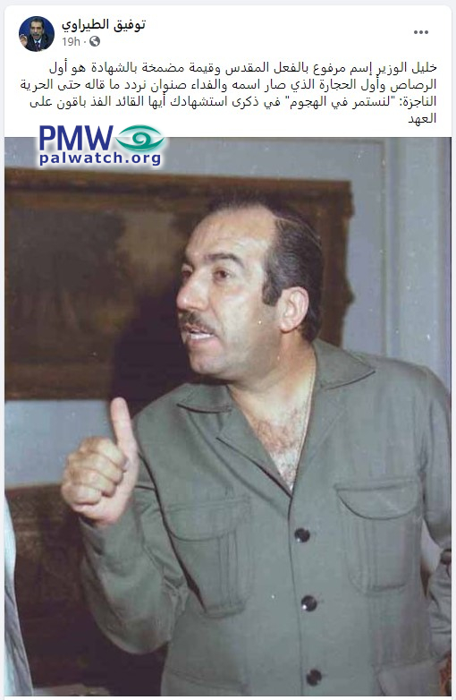 Posted text: “Khalil Al-Wazir [‘Abu Jihad’] – a lofty name thanks to the sacred activity and a value that is anointed with Martyrdom – is the First Bullet and the First Stone, whose name became synonymous with a self-sacrificing fighter. Let us repeat what he said until full freedom: ‘We will continue to attack.’ On the anniversary of your death as a Martyr, O commander, we remain loyal to the path.”