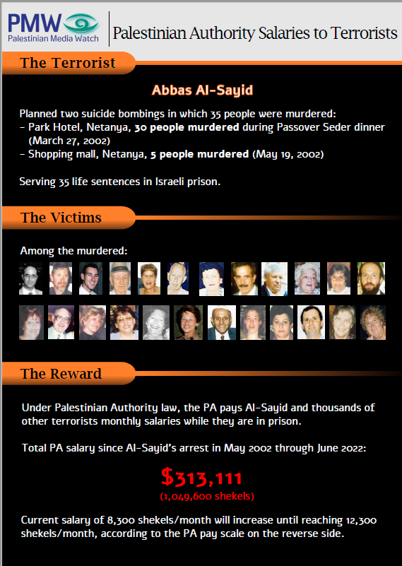 Every month, the PA pays tens of thousands of shekels/dollars/euros rewarding the terrorists involved in the attack