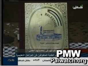 Plaque with a map including the PA areas and all of Israel (excluding the Golan Heights), awarded by the Palestinian Embassy in Syria to outstanding Palestinian students living in Syria. The plaques were shown as part of a PA TV News broadcast.