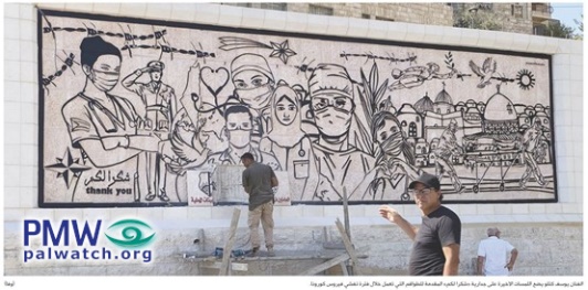 The picture shows a wall mural dedicated to the medical staff working to fight the Coronavirus pandemic. In the middle of medical staff figures on the left side of the mural, a stethoscope is seen checking the pulse of the PA map of “Palestine” that presents all of Israel together with the PA areas as “Palestine.” In the bottom left corner of the mural is written “thank you” in Arabic and English. On the right side of the map is Jerusalem, with the Dome of the Rock and the Church of the Holy Sepulchre visible.