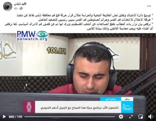 The video shows an interview with Fatah Spokesman in the Nablus District on the Hayat radio station.