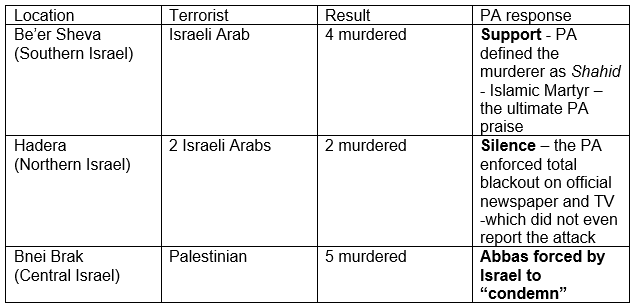 Having promoted terror for 2 months, the PA glorified the first terror attack in which 4 Israelis were murdered. After criticism from Israel, the PA was silent about the second attack in which 2 were murdered. And then only when Israel's defense minister and the United States pressured Abbas he issued a lame condemnation.