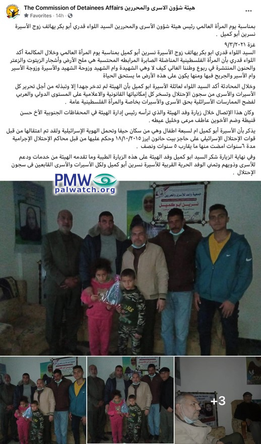 Posted text: “For International Women’s Day, Director of [PLO] Commission of Prisoners and Released Prisoners’ Affairs Qadri Abu Bakr spoke by phone with the husband of prisoner Nasrin Abu Kmeil (arrested on Oct. 18, 2015 and sentenced to 6 years; PMW was unable to determine the nature of her crimes -Ed.)