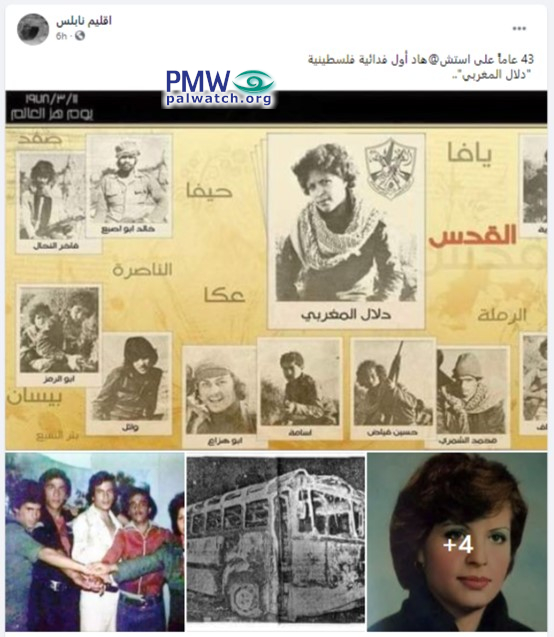 The main image shows pictures of terrorist Dalal Mughrabi and the other members of her terror group who murdered 37 civilians, 12 of them children. In the upper right corner of Mughrabi’s picture is the Fatah logo that includes a grenade, crossed rifles, and the PA map of “Palestine” that presents all of Israel together with the PA areas as “Palestine.” In the background of the image are the names of the following Israeli cities: Jaffa, Ramle, Haifa, Acre, Nazareth, Safed, Beit Shean, and Be’er Sheva.