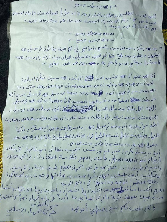 In the note he wrote of his motivation to commit a terror attack and die as a Martyr: