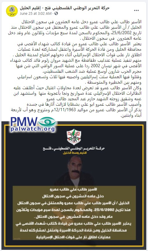 Posted text: “Prisoner Taleb Ali Taleb Amr (i.e., terrorist, involved in the murder of 6 poeple) began his 20th year in the occupation’s prisons