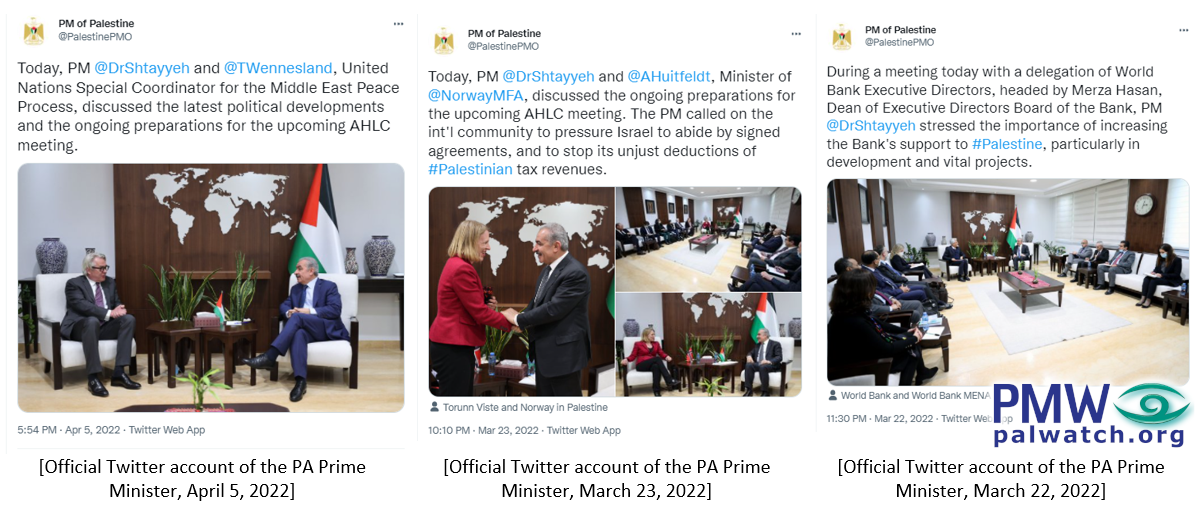 Amazingly, while the PA is taking active steps to prevent any semblance of financial transparency, PA Prime Minister Muhammad Shtayyeh is holding high-level meetings with UN and other officials in preparation for the upcoming gathering of the Ad-Hoc Liaison Committee (AHLC - An international group of donors that coordinates aid to the PA)