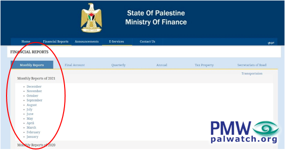 The PA’s decision to block all access to the reports on the site of the Ministry of Finance was taken after PMW used the reports to demonstrate how the PA spent 841 million shekels/$270.75 million, in 2021 alone, paying financial rewards to imprisoned terrorists, released terrorists, wounded terrorists, and the families of dead terrorists.
