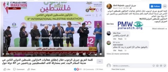 Posted text: “The words of [Fatah Central Committee Secretary] Maj. Gen. Jibril Rajoub at the opening of the 8th Palestine Marathon events in the city of peace, Bethlehem”