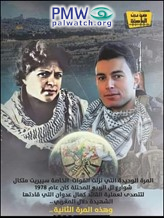 The altered image shows terrorist Ra’ad Hazem who murdered 3 on the right and terrorist Dalal Mughrabi, who led the murder of 37, 12 of them children, holding an assault rifle on the left. In the center at the bottom is the Fatah logo that includes a grenade, crossed rifles, and the PA map of “Palestine” that presents all of Israel together with the PA areas as “Palestine.” In the background is the Temple Mount.