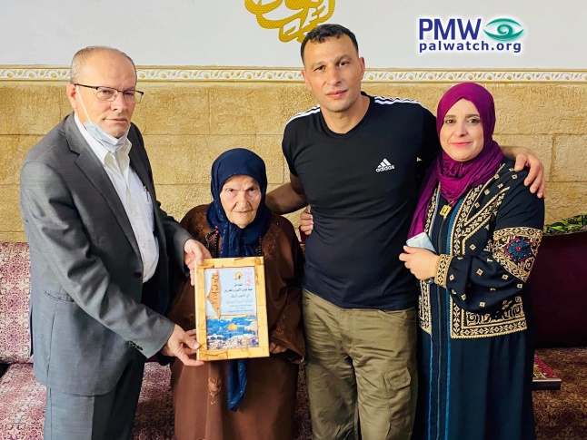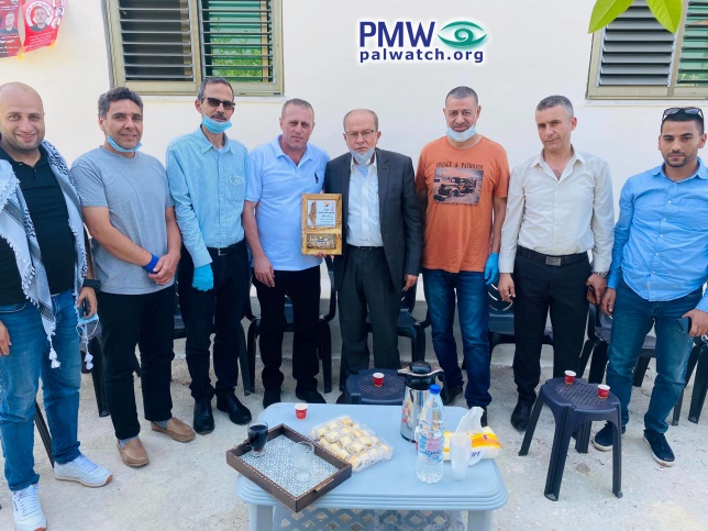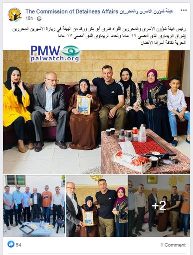 Posted text: “Director of [PLO] Commission of Prisoners and Released Prisoners’ Affairs Qadri Abu Bakr and a delegation from the commission in a visit to released prisoners Ashraf Al-Rimawi who served 19 years and Ahmed Al-Rimawi who served 17 years (PMW was unable to determine the nature of their crimes –Ed.)