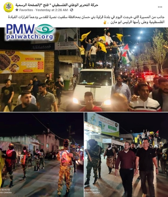 Posted text: “Part of the procession that went out today [May 1, 2021] in the town of Qarawat Bani Hassan in the Salfit district for the sake of Jerusalem and as a sign of support for the decisions of the Palestinian leadership led by [PA] President Mahmoud Abbas.”