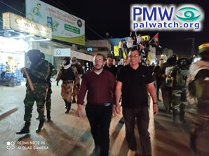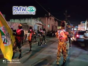 The images show the procession, in which masked men in military uniform are seen holding posters of PA Chairman Mahmoud Abbas and yellow Fatah flags.