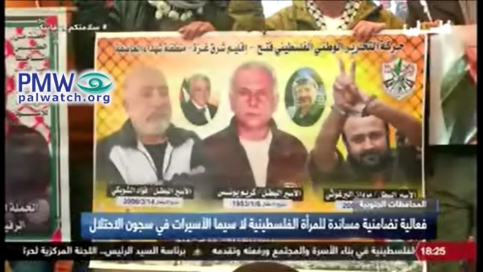 The screenshot shows a poster held at the demonstration featuring from left to right: Fuad Al-Shubaki, a senior PA official and weapons smuggler; PA Chairman Mahmoud Abbas; terrorist Karim Younes, who murdered 1 together with an accomplice; former PLO and PA Chairman Yasser Arafat; terrorist Marwan Barghouti, who orchestrated three attacks in which 5 were murdered; and the Fatah logo. Text below the terrorists Al-Shubaki, Younes, and Barghouti glorifies each as “the heroic prisoner”.