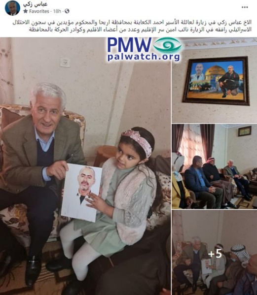 Posted text: “[Fatah Central Committee member] brother Abbas Zaki during a visit in the Jericho district to the family of prisoner Ahmad Kaabneh (i.e., terrorist, murdered 2), who was sentenced to 2 life sentences in the Israeli occupation’s prison. He was accompanied during the visit by the [Fatah Jericho] branch deputy secretary and a number of members of the branch and Fatah activists in the district.”