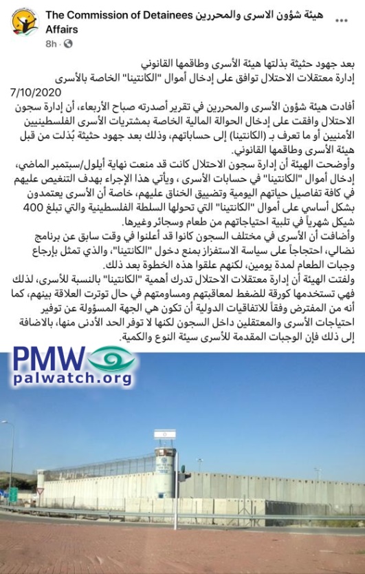 Posted text: “Following intensive efforts invested by the [PLO] Commission of Prisoners’ Affairs and its legal teams, the occupation’s prison management (i.e., Israeli Prison Service) has agreed to let in the prisoners’ canteen money