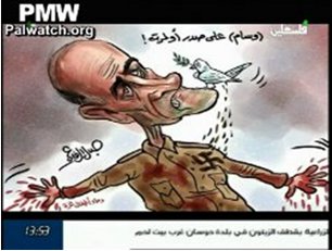 This cartoon was broadcast as part of a PA TV interview with the Palestinian cartoonist. The cartoon was originally published during the 2008 Gaza War between Israel and Hamas.