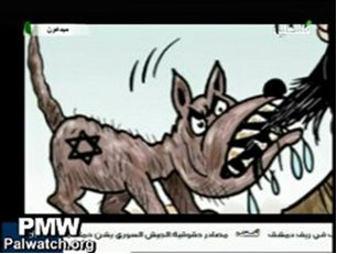 Israel as dogOfficial Palestinian Authority TV|Oct 10, 2011This cartoon was broadcast as part of a PA TV interview with the Palestinian cartoonist. The cartoon was originally published during the 2008 Gaza War between Israel and Hamas.