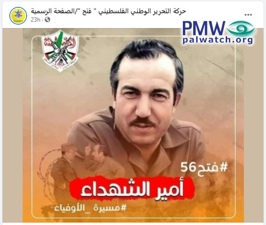 The image posted on occasion of the 56th anniversary of “the Launch” of Fatah, counted from its first terror attack against Israel, shows terrorist Khalil Al-Wazir “Abu Jihad,” who was responsible for the murder of 125. In the upper left is the Fatah logo that includes a grenade, crossed rifles, and the PA map of “Palestine” that presents all of Israel together with the PA areas as “Palestine.” In the bottom left is a picture of Al-Wazir speaking with former PLO and PA Chairman Yasser Arafat.