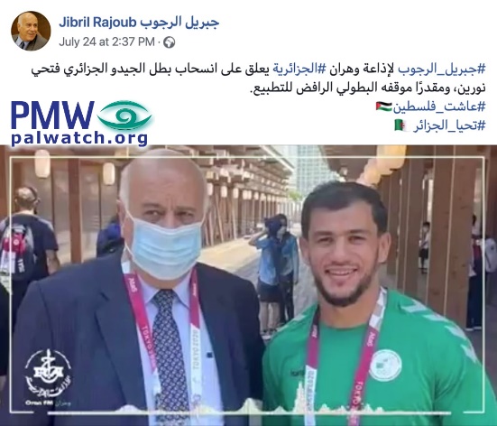 Posted text: “[Chairman of the Palestine Olympic Committee] #Jibril_Rajoub to the #Algerian Oran radio [station]. He relates to Algerian judoka Fethi Nourine withdrawing (i.e., refusing to compete against an Israeli) and honors his heroic positionopposing normalization [with Israel].