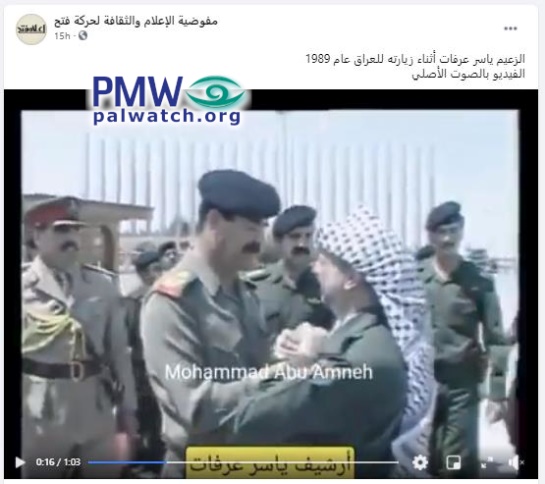 Fatah boasts that Yasser Arafat embraced Saddam Hussein during his 1989 visit