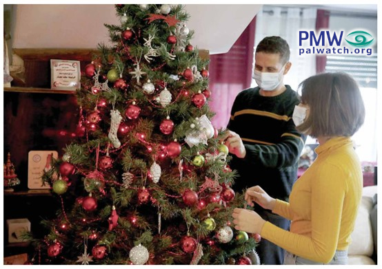 The article includes a picture of the Christmas tree decorations. On a shelf in the background on the left is a decoration with the PA map of “Palestine” that presents all of Israel together with the PA areas as “Palestine” on it.