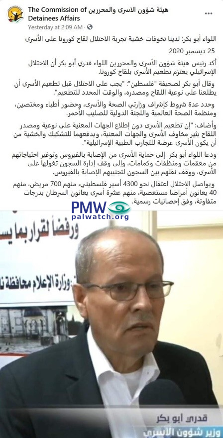Posted text: “[Director of PLO Commission of Prisoners’ Affairs] Qadri Abu Bakr: We have concerns about the occupation’s attempt to vaccinate the prisoners [against] the Coronavirus