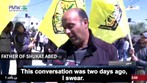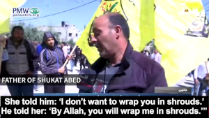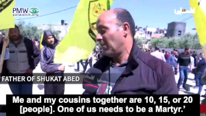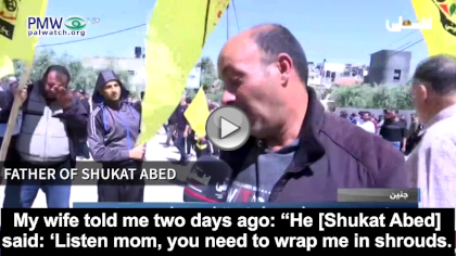 The father of 17-year-old Shukat Abed, who was recently killed while participating in violent riots in Kafr Dan north of Jenin, told official PA TV at his son’s funeral that his son had expressed his wish to become a “Martyr.” A few days before his death, Shukat Abed had argued that since he and his cousins were so many in number, “one of them needed to be a Martyr.” He had notified his mother that she should “wrap him in shrouds,” and when taking a selfie, he indicated that the family would use the photo when he would soon die as a Martyr: