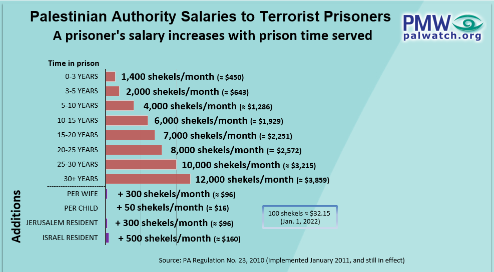 The salaries the PA will pay the terrorists, aged 19 and 20, will start at 1,400 shekels ($450)/month and will increase with time spent in prison to 12,000 shekels (3,859) /month.