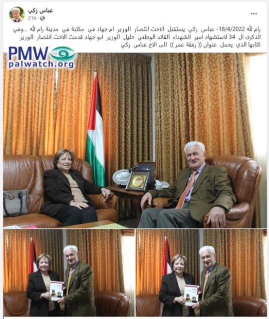 [Fatah Central Committee member] Abbas Zaki welcomed [Chairwoman of the PLO Families of the Martyrs and Wounded Institution] Intisar Al-Wazir ‘Um Jihad’ (i.e., the widow of terrorist Khalil Al-Wazir “Abu Jihad,” who was responsible for the murder of 125) at his office in Ramallah. On the 34th anniversary of the death as a Martyr of the Prince of Martyrs, national commander Khalil Al-Wazir ‘Abu Jihad,’ Intisar Al-Wazir presented her book 'Companion for Life’ to Abbas Zaki.”