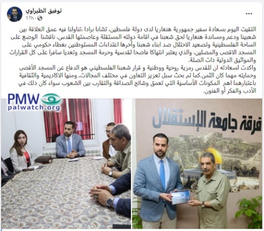 Posted text: “I met today [April 19, 2022] with Ambassador of Hungary in the State of Palestine [Csaba Rada]… and I emphasized to him that Jerusalem has spiritual and national symbolism, and our Palestinian people’s decision is to defend the Al-Aqsa Mosque and protect it at all costs (refers to violent Arab riots on the Temple Mount -Ed.).”