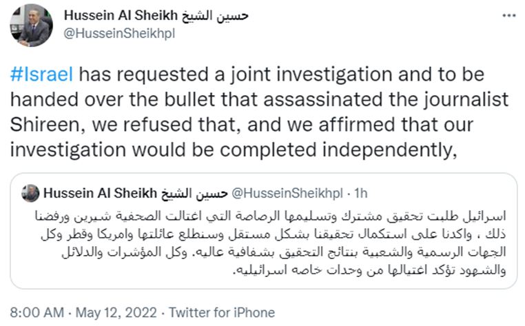 After Al Jazeera reporter is killed in Jenin, senior Palestinian Authority official denies Israel from taking part in the investigationMay 12, 2022