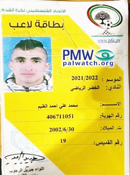 The article includes a picture of terrorist Muhammad Ghneim’s Palestinian Football Association player’s card.