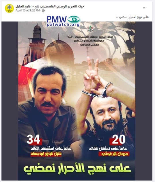 The image shows terrorist Khalil Al-Wazir “Abu Jihad,” who was responsible for the murder of 125, on the left, and terrorist Marwan Barghouti, who orchestrated three attacks in which 5 were murdered, on the right. In the background is the Dome of the Rock and the Al-Aqsa Mosque, as well as a Palestinian flag and a keffiyeh (Arab headdress).