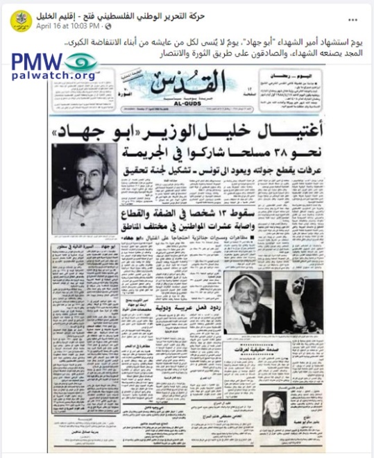 Posted text: “The anniversary of the death as a Martyr of the Prince of Martyrs [Khalil Al-Wazir] ‘Abu Jihad,’ a day that will not be forgotten by anyone who experienced it from among the people of the great [first] Intifada (i.e., Palestinian wave of violence and terror against Israel, approximately 200 Israelis murdered, 1987-1993).