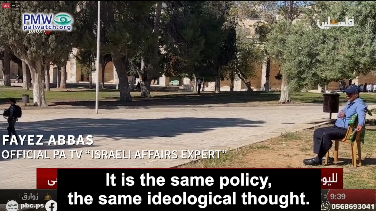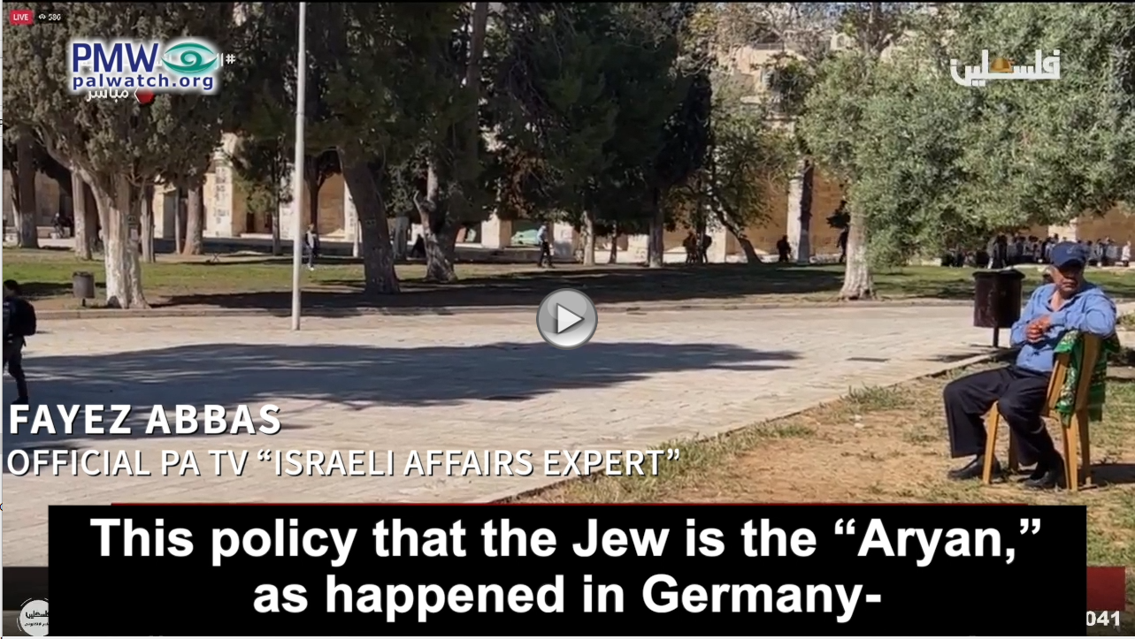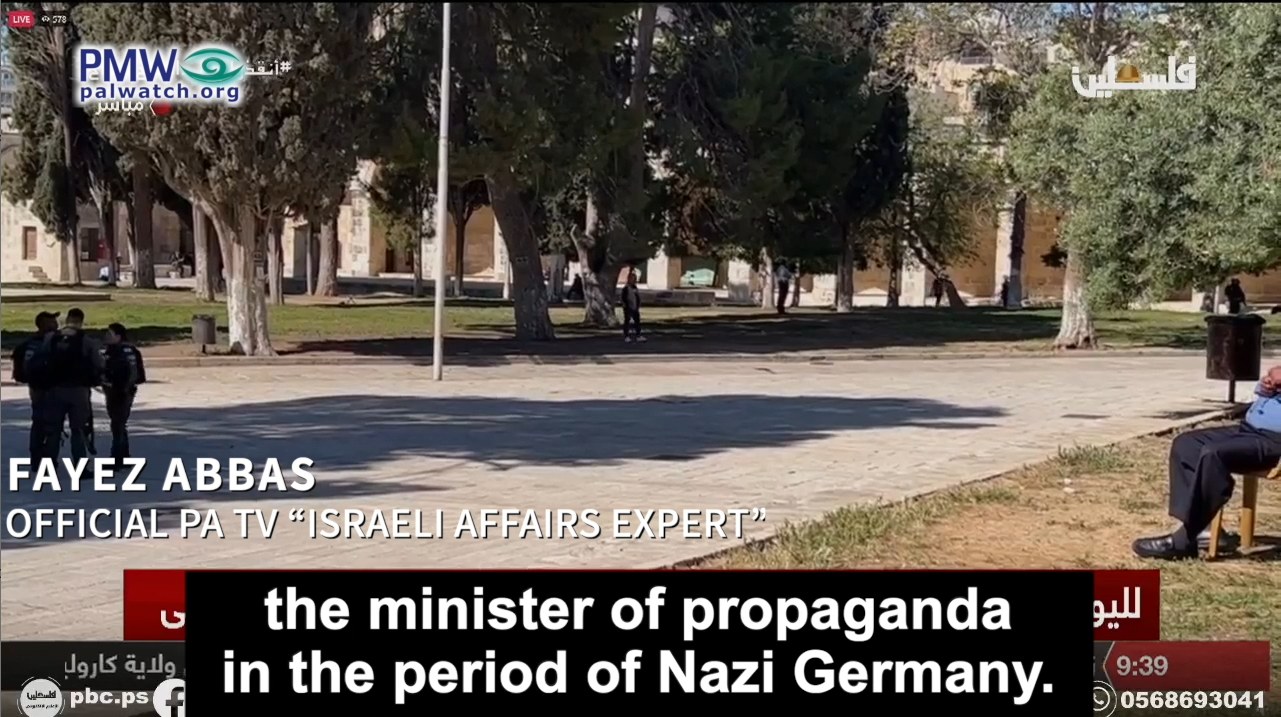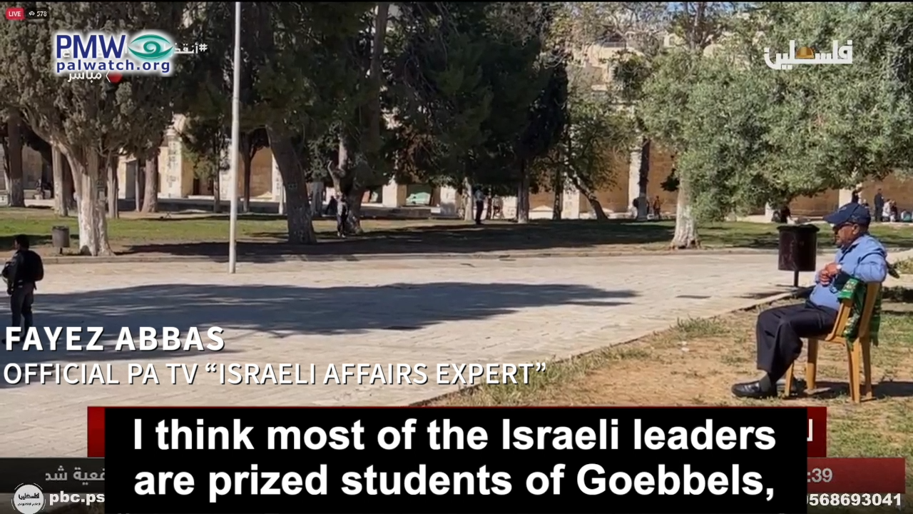 Official PA TV “Israeli affairs expert” Fayez Abbas: What is happening now in the Al-Aqsa Mosque plaza and what will happen tomorrow or in two days at the Church of the Holy Sepulchre plaza is the greatest proof that Israel has declared religious war against Islam and Christianity at the same time... A religious war and Israeli apartheid... This policy that the Jew is the “Aryan,” as happened in Germany- It is the same policy, the same ideological thought. I think most of the Israeli leaders are prized students of Goebbels, the minister of propaganda in the period of Nazi Germany.”