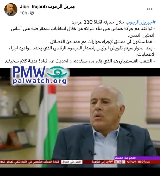 Posted text: “[Fatah Central Committee Secretary] #Jibril_Rajoub in a conversation with the BBC Arabic channel: