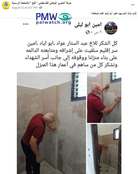Posted text in screenshot: “Many thanks to [Fatah’s] Salfit Branch Secretary brother Abd Al-Sattar Awwad ‘Abu Iyad’ for his continuous overseeing and monitoring of the construction of our home, and for his standing with the Martyrs’ families. We thank all those who took part in constructing this home.”