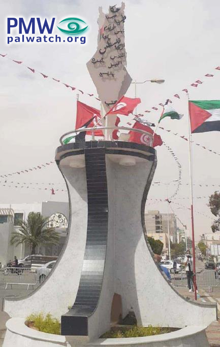 The image shows the monument in Medenine, Tunisia, featuring the PA map of “Palestine” that presents all of Israel as “Palestine” together with the PA areas. Palestinian and Tunisian flags are flying around the monument.