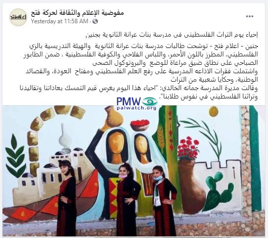 Posted text: “Commemorating Palestinian Heritage Day at the Arranah High School for Girls in Jenin
