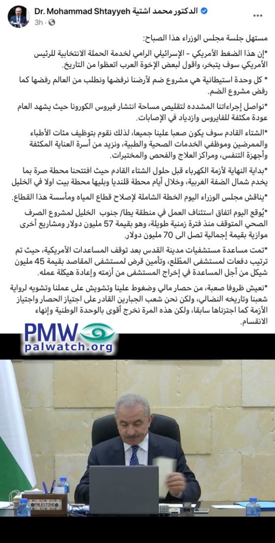 Video and text posted on the Facebook page of PA Prime Minister Muhammad Shtayyeh