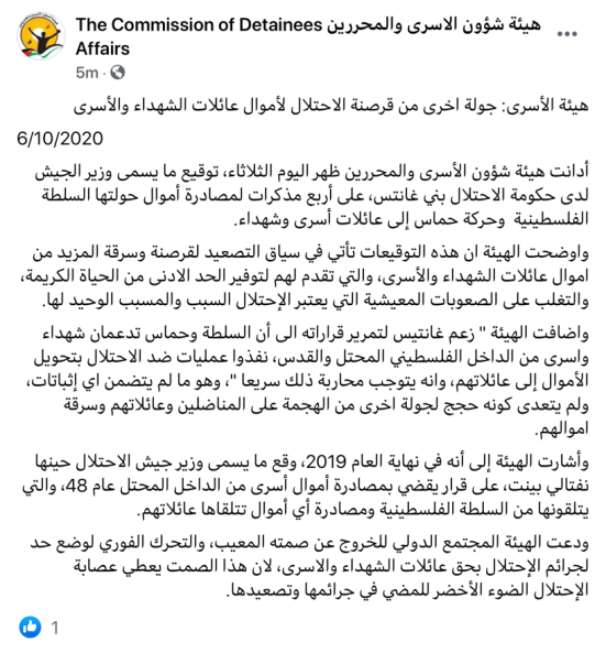 Posted text: “The [PLO] Commission of Prisoners’ Affairs: An additional round of the occupation’s piracy of the money of the families of the Martyrs and the prisoners
