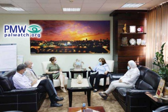The article includes a picture from the meeting in PA Minister of Health Mai Al-Kaila’s office; on the upper shelf in the background on the right is a decoration in the shape of the PA map of “Palestine” that presents all of Israel as “Palestine” together with the PA areas.