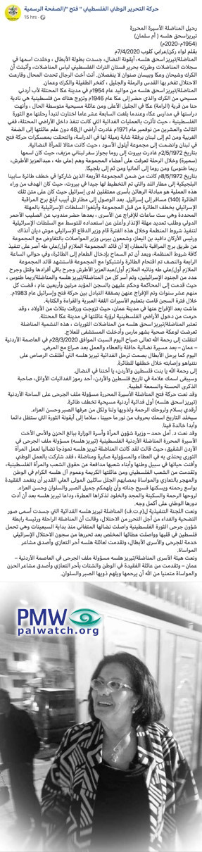 The Fatah Movement eulogized fighter, released prisoner, and director of the wounded in the Jordanian arena (Theresa Is'haq Halsa) [parentheses in source], the first Jordanian female self-sacrificing fighter to hijack a plane…