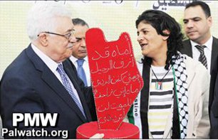 Abbas with released prisoner Amal Jum'a at one of the Fatah Revolutionary Council's meetings. Abbas is holding a representation of the PA map of "Palestine" that includes Israel and the PA areas.