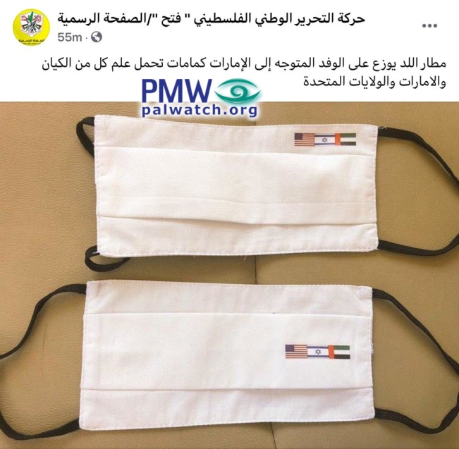Fatah shares image of face masks featuring Israeli, American and UAE flags