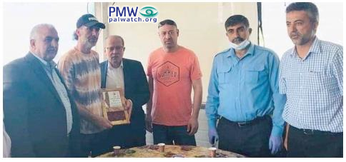 The article includes an image showing Director of PLO Commission of Prisoners’ Affairs Qadri Abu Bakr presenting an honorary plaque featuring the PA map of “Palestine” that presents all of Israel as “Palestine” together with the PA areas to released prisoner Salah Hussein during a visit to Hussein’s house. Hussein served a 15 year sentence during which he had a child from sperm he smuggled out of prison.
