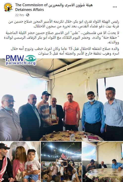 The image shows Director of PLO Commission of Prisoners’ Affairs Qadri Abu Bakr presenting an honorary plaque featuring the PA map of “Palestine” that presents all of Israel as “Palestine” together with the PA areas to released prisoner Salah Hussein during a visit to Hussein’s house – PMW was unable to determine the nature of Hussein’s crimes. Hussein served a 15 year sentence during which he had a child from sperm he smuggled out of prison.