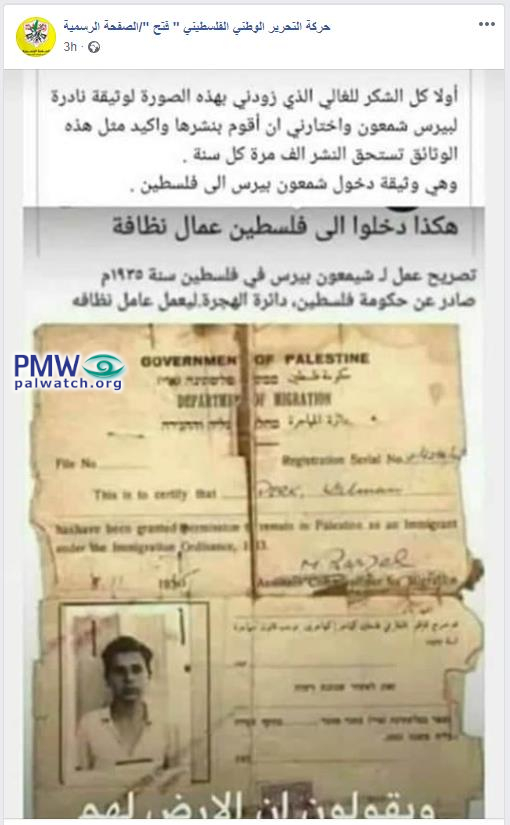 Shimon Peres entered "Palestine" illegally on a work permit, not an immigrant permit, lies Fatah