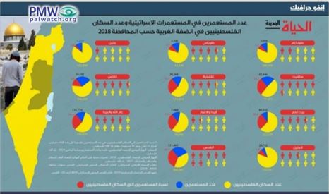 Text on infographic: “The number of settlers in the Israeli settlements and the number of Palestinian residents in the West Bank according to district, 2018"